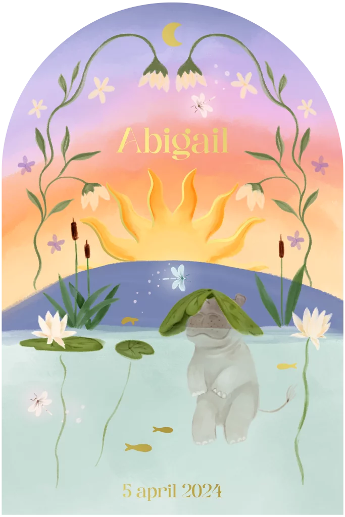 Een boog kaartje met een nijlpaard dobberend in het water. Omringd met bloemen, waterlelies en een ondergaande avondzon.
