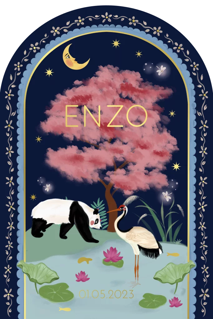 Een geboortekaartje met veel invloeden vanuit het Verre Oosten. De panda en kraanvogel samen bij de vijver met waterlelies. De panda staat in Azië symbool voor harmonie en wordt daarmee vaak in relatie gebracht met yin en yang. De kraanvogel wordt gezien als boodschapper van geluk.