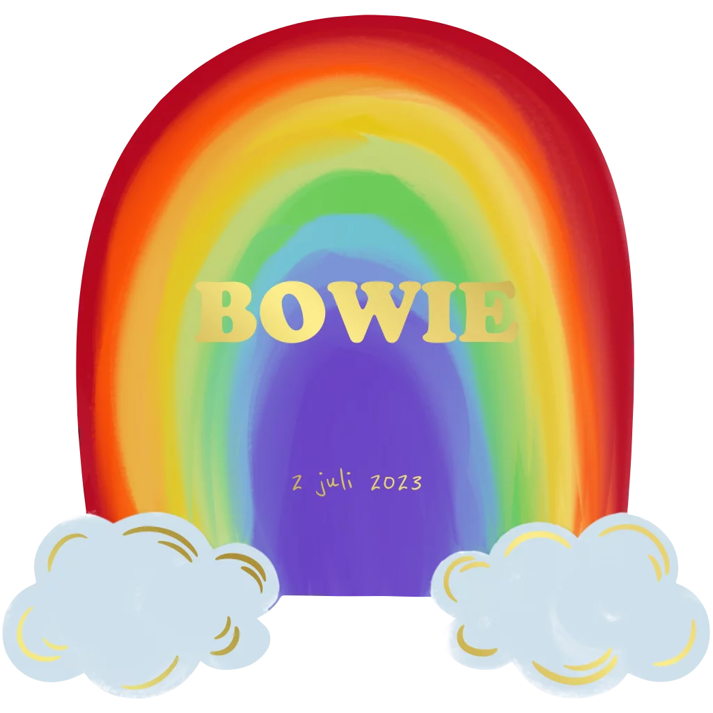 Een kaartje in de vorm van een regenboog. Vol met kleur en afgemaakt met twee wolkjes onderaan de boog.
