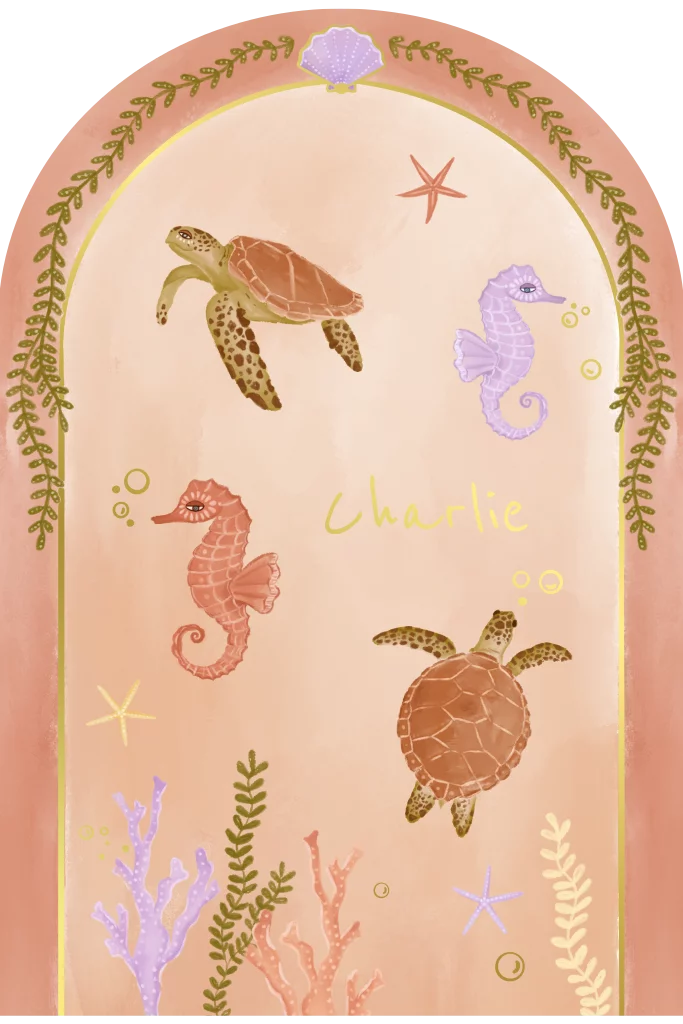 Een geboortekaartje met een kleurrijk zeethema. Sierlijke zeepaardjes en lieve schildpadden omringd met koraal.