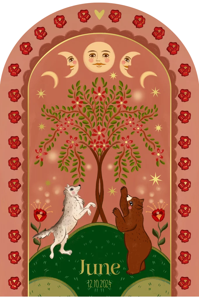 Het sprookje onder de boom gaat verder. Dit keer met de wolf en de beer met verschillende bloemen en maanstanden.