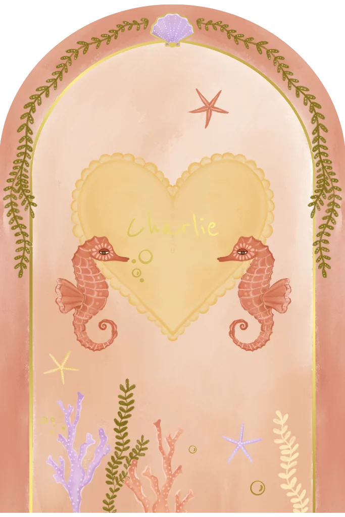 Sierlijke zeepaardjes rond een hart omring met koraal.