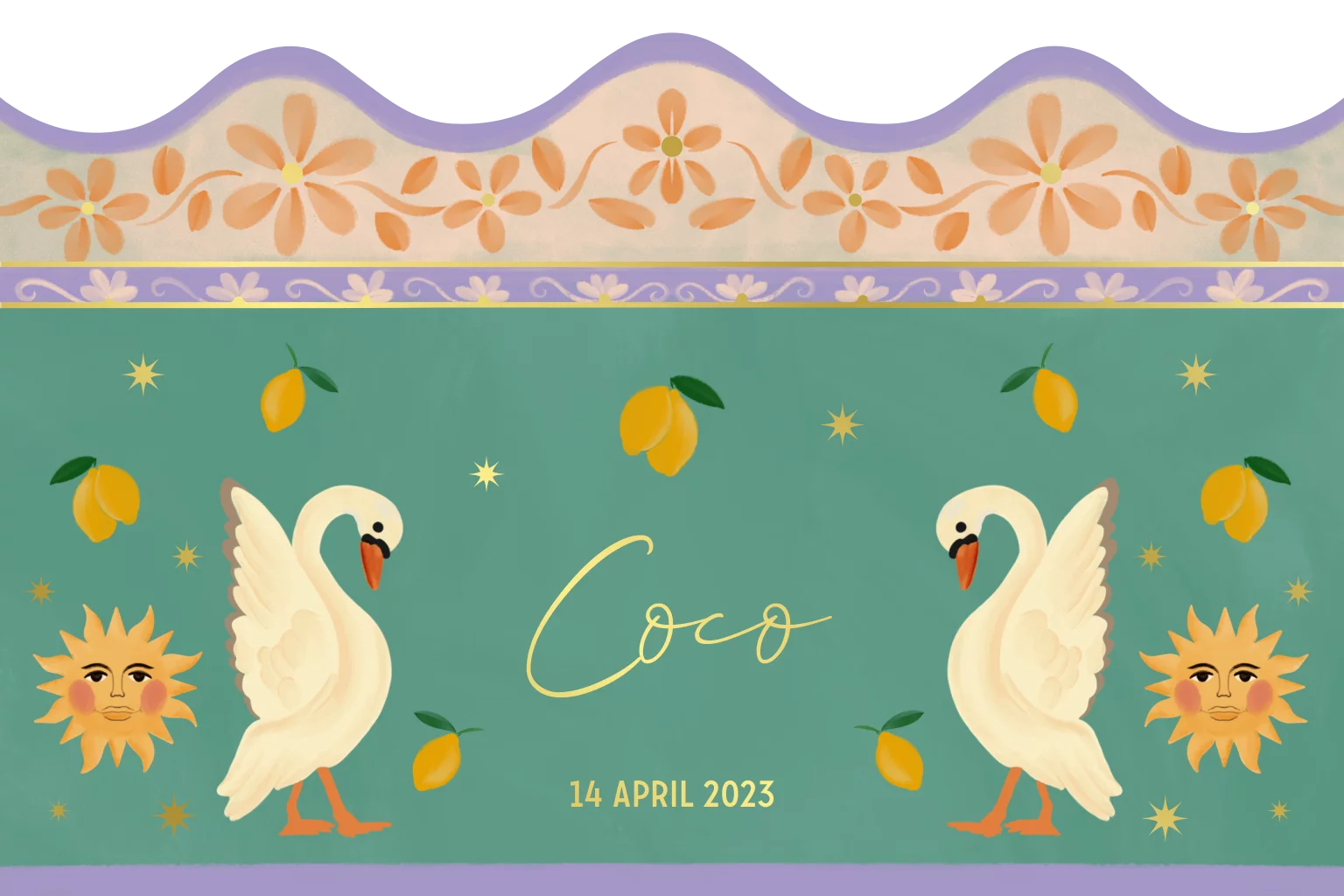 Geboortekaartje zwanen, citroenen, zon en bloemen in aqua met lila