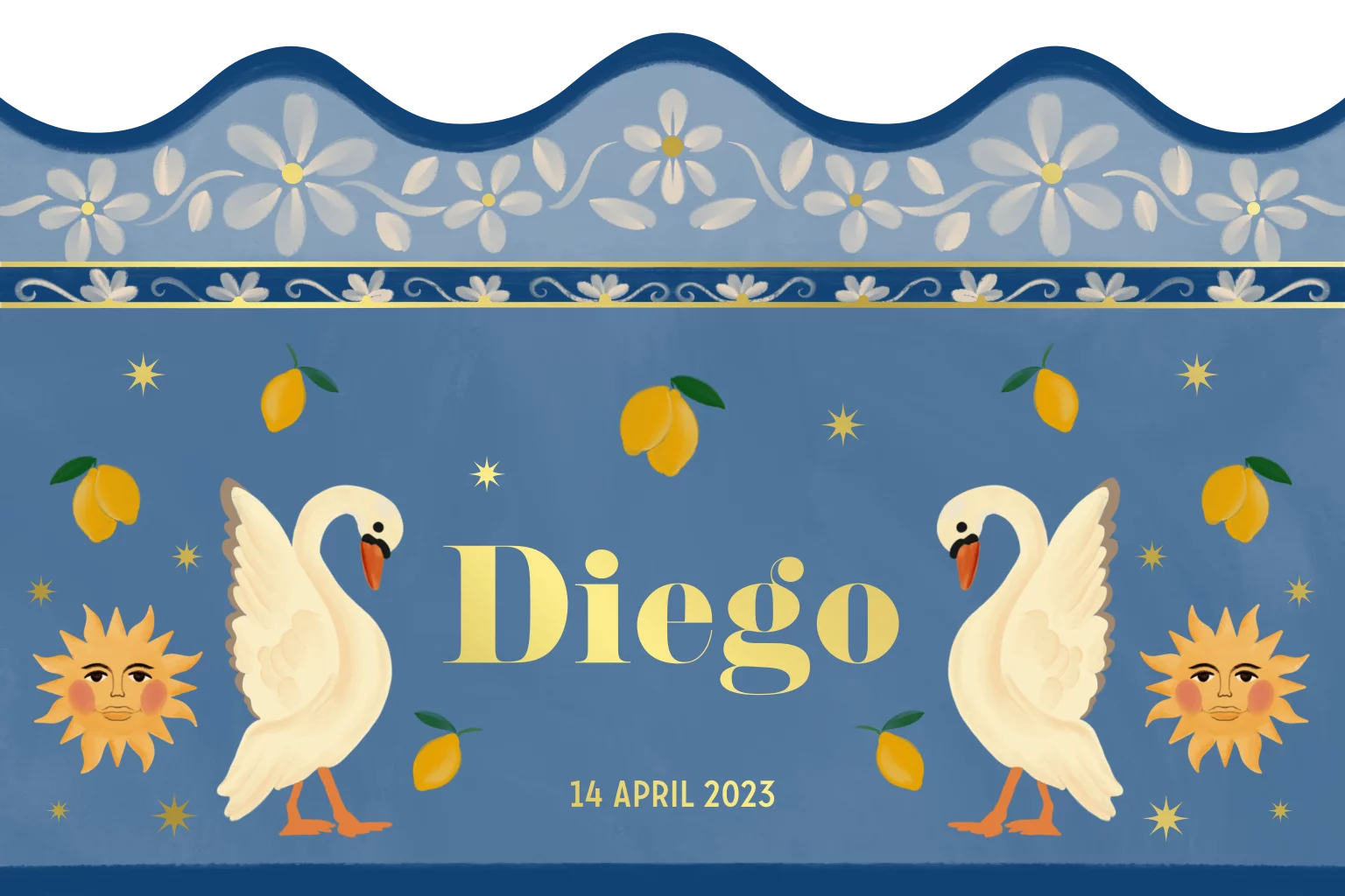 Geboortekaartje zwanen, citroenen, zon en bloemen in blauw