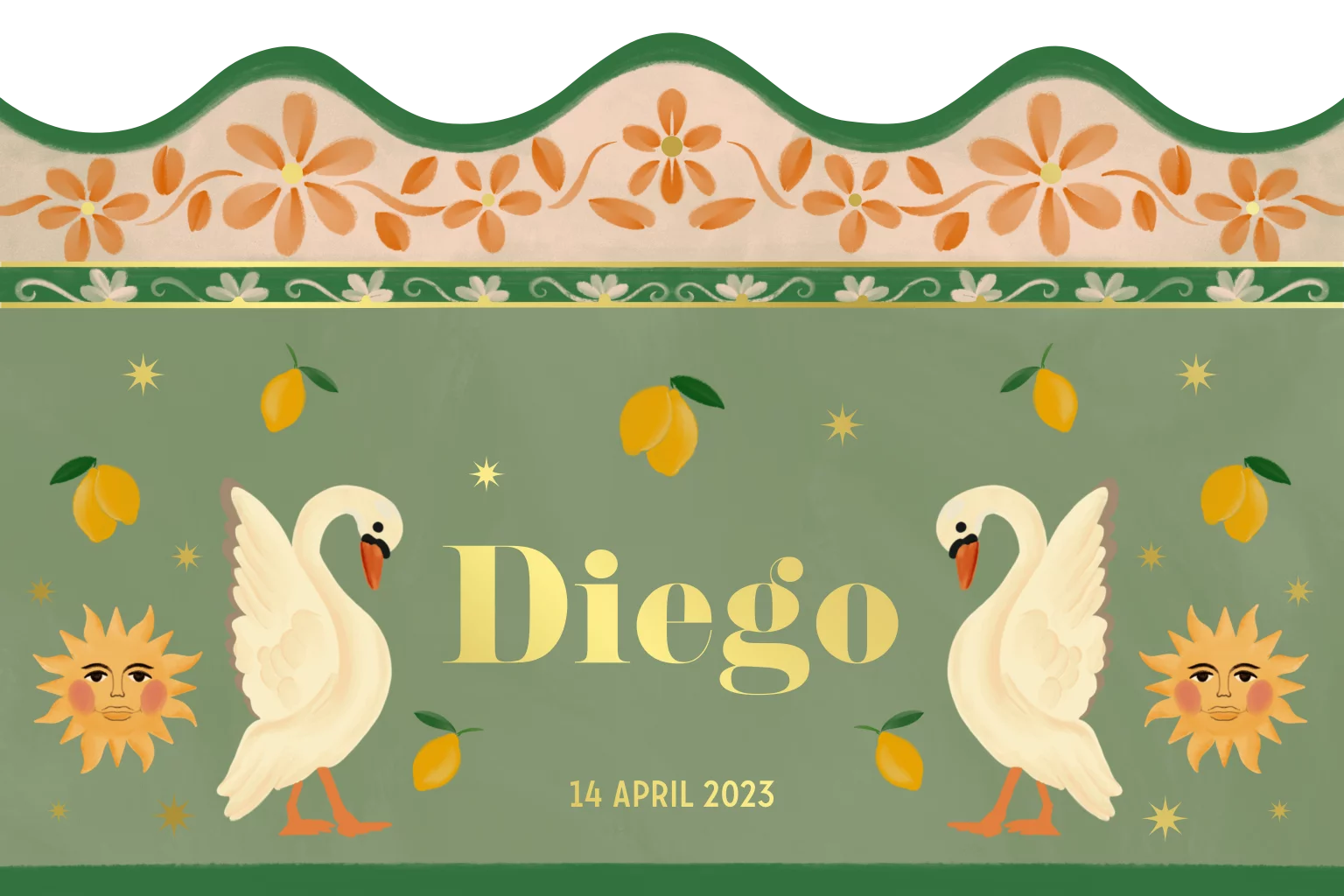 Geboortekaartje zwanen, citroenen, zon en bloemen in groen