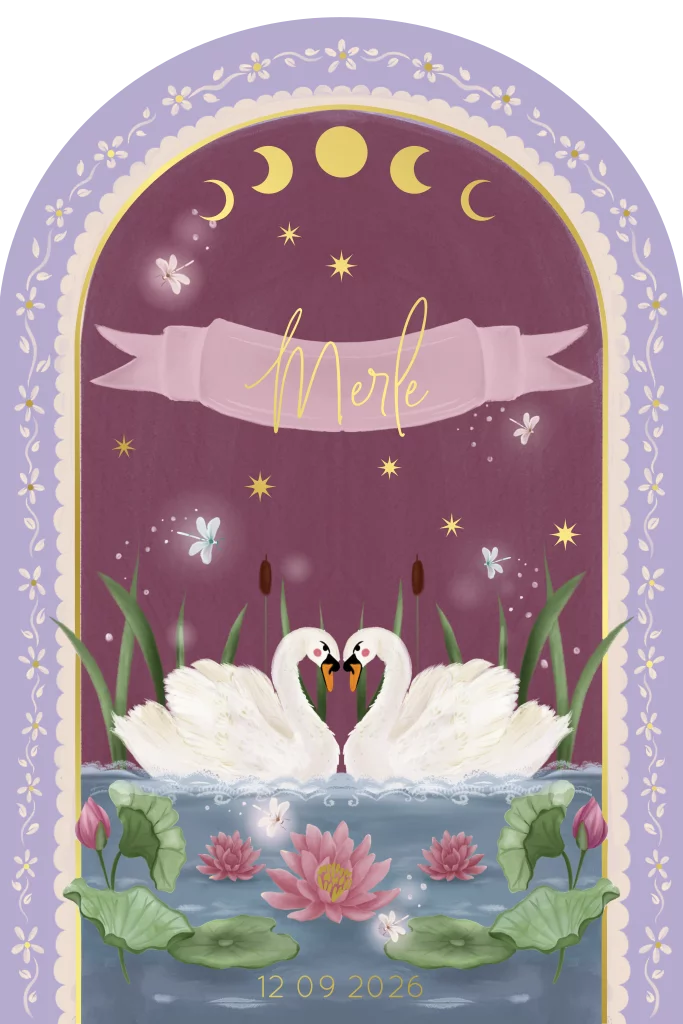 Een sprookjesachtig en romantisch geboortekaartje met twee zwanen in een boog vorm. De, bijna lichtgevende, libellen en de sterren geven het kaartje een magisch gevoel.