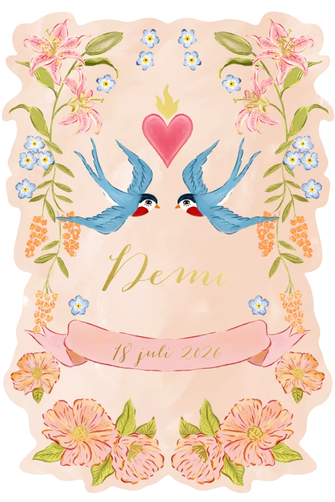 Een geboortekaartje met de boerenzwaluw omringd door kleurrijke bloemen.