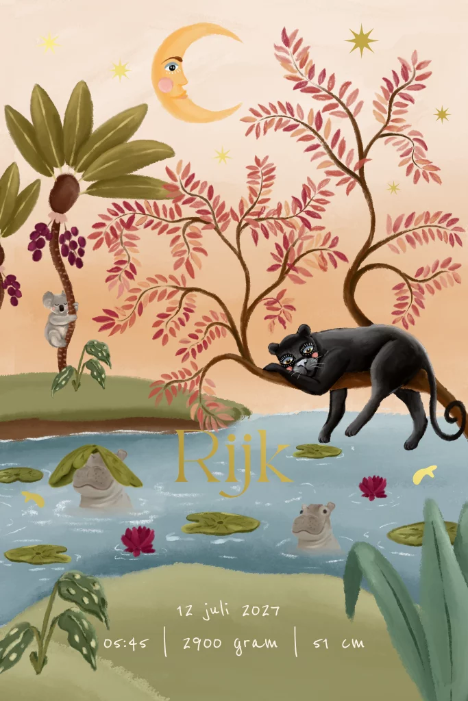 Krijg jij ook helemaal het jungle book gevoel? Benieuwd wat er zich aan de binnenkant afspeelt. Via het doorkijkje kun je al een glimp van de details opvangen. De panter hangend in een boom omringd door nijlpaardenplanten en een koala in de palmboom.