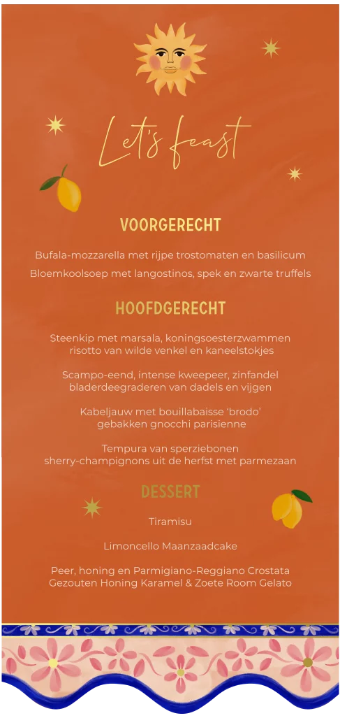 Een menukaart met heerlijk warme tinten. Het past helemaal bij een bruiloft met een Mediterraans gevoel.