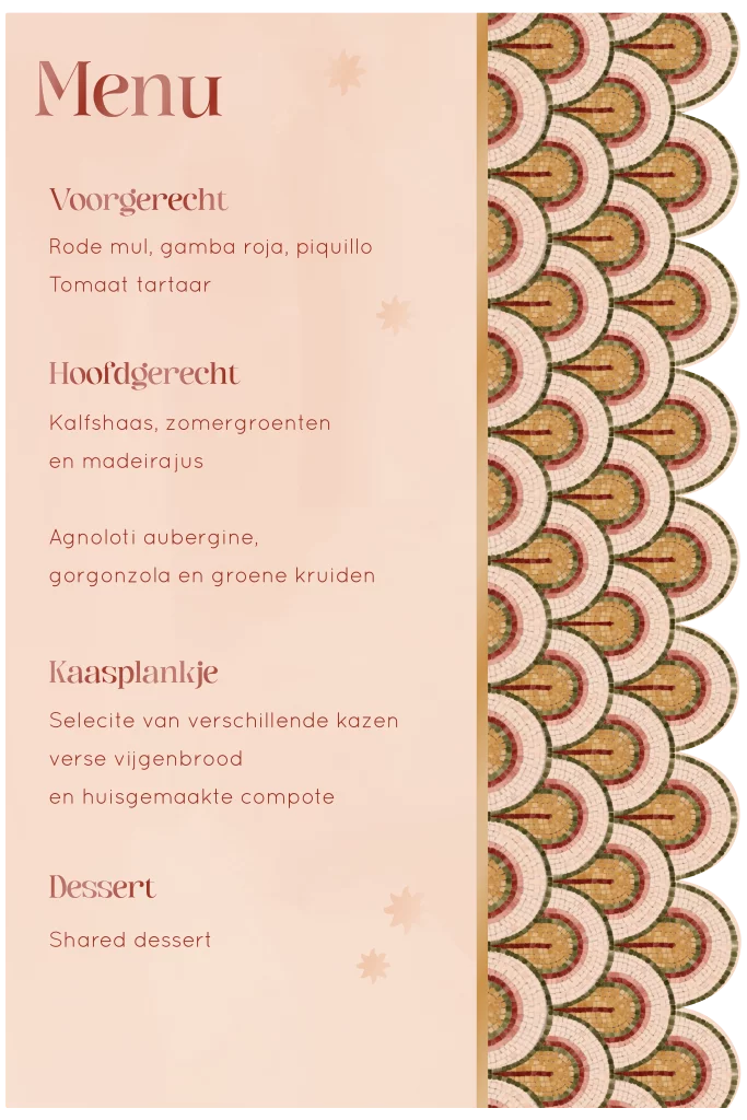 Deze menukaart sluit perfect aan bij de mozaiek collectie. Prachtige kleuren met roze, geel en groen. De kleine steentjes zijn toch net echt? Wij zijn fan!