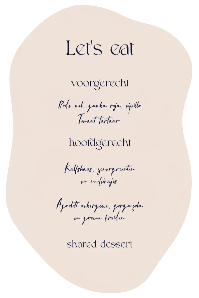 Een menukaart met een organische vorm in de kleur beige. Pas het menu volledig aan en vertel wat jouw gasten kunnen verwachten tijdens het diner.