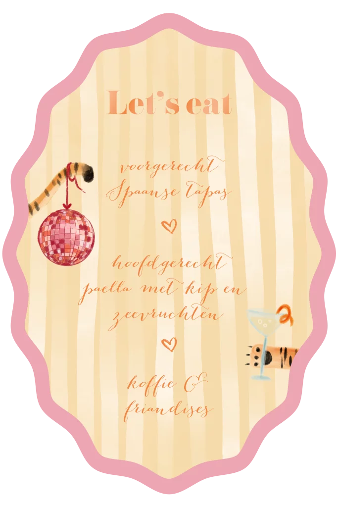 Een feestelijke menukaart met gele strepen en een roze rand.