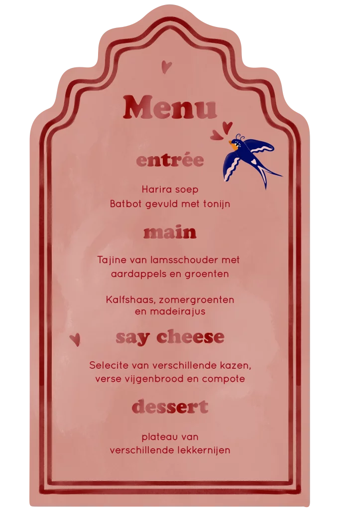 Helemaal in de kleur van de liefde. De roze met rode menukaart wordt aangevuld met een zwaluw.