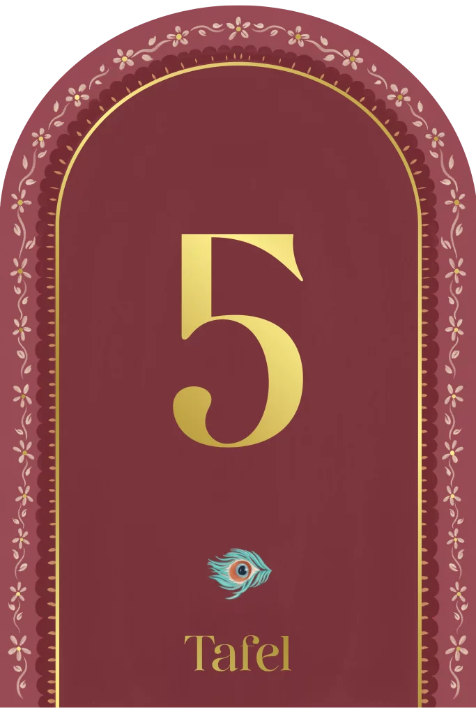 Tafelnummers in lijn met de trouwkaart met citroenboom en de pauw.