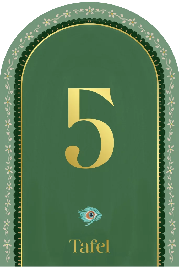 Tafelnummers in lijn met de trouwkaart met citroenboom en de pauw.