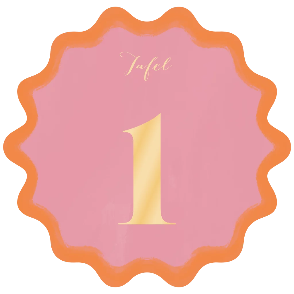Passend bij de trouwhuisstijl met gele strepen deze kleurrijke tafelnummer is roze met oranje.