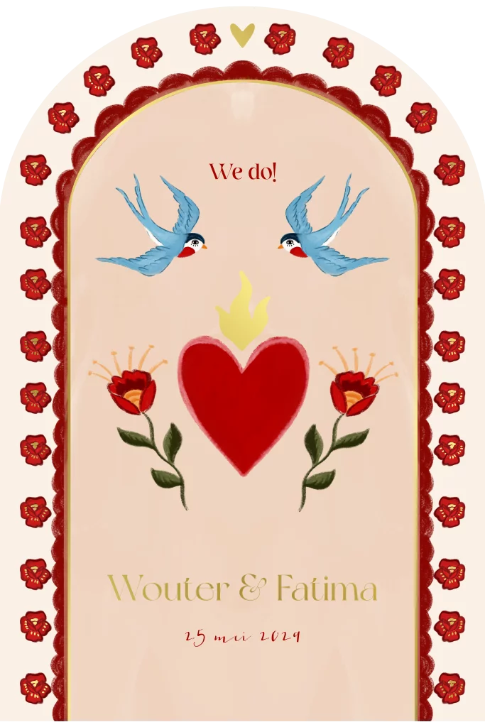 Een prachtig stijlvolle trouwkaart met een hart en bloemen met daarboven twee zwaluwen.
