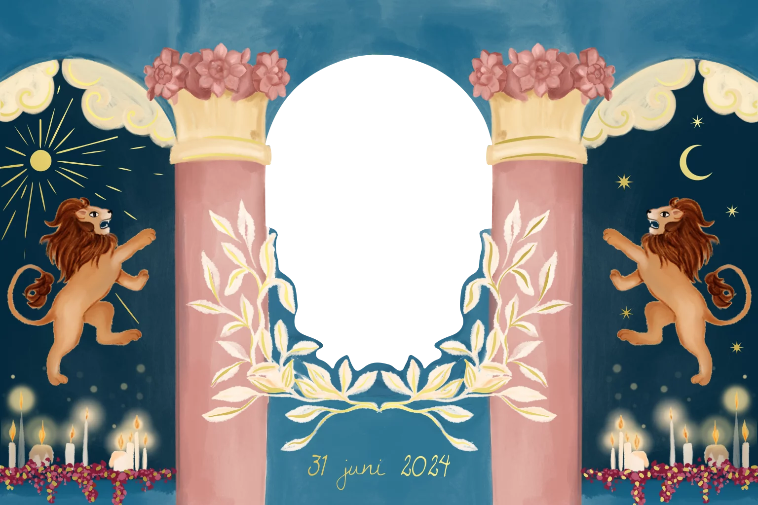 Echt een unieke trouwkaart met een doorkijk waar je alvast de initialen ziet staan. Het lijkt toch net of de kaarsjes branden. Klassieke pilaren, kleine gouden details en een kleurrijke binnenkant.