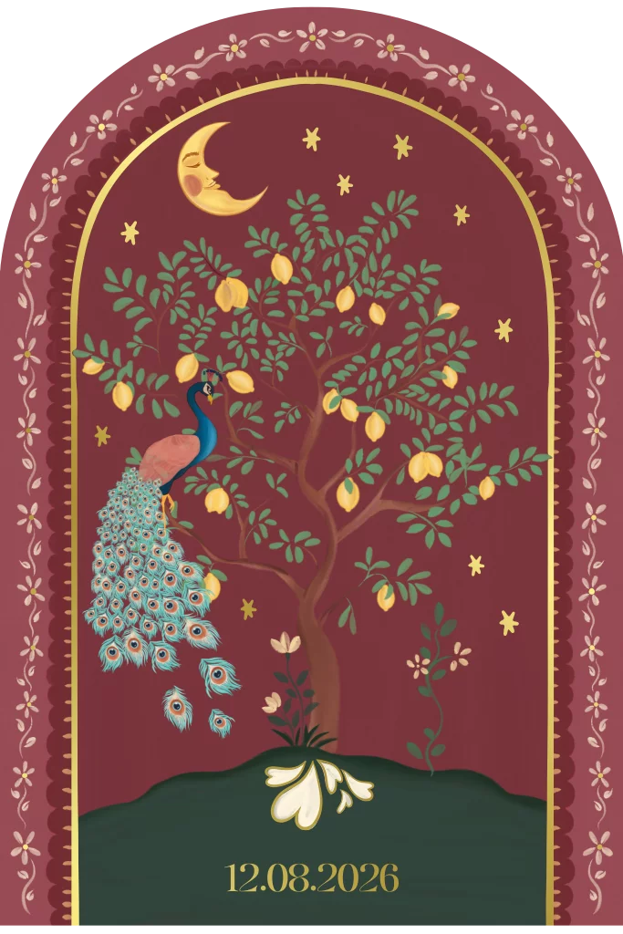 Een trouwkaart met een frisse citroenboom waar de pauw trots in zit.