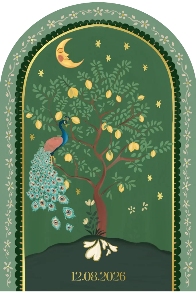 Een trouwkaart met een frisse citroenboom waar de pauw trots in zit.