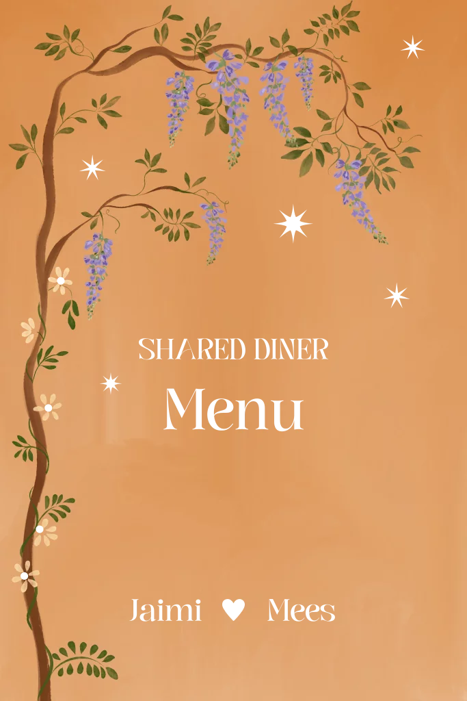 Een heel stijlvolle menukaart in de kleur peach. De bloemen doen je denken aan de bekende blauwe regen.