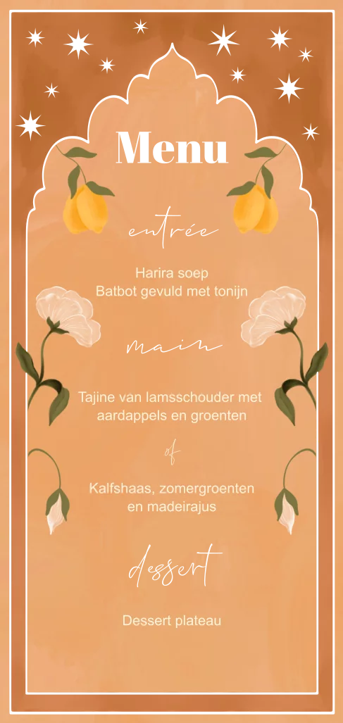 In lijn met de trouwkaart met de bloemen. Een menukaart met daarom bloemen, sterren, citroenen en een sierlijke omlijsting.