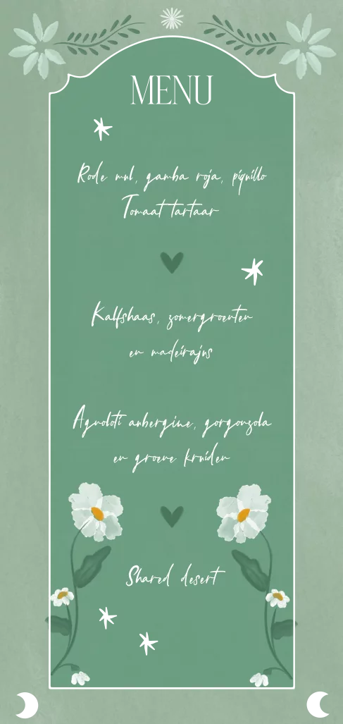 Een menukaart in bohemian stijl met bloemen in de kleur groen.