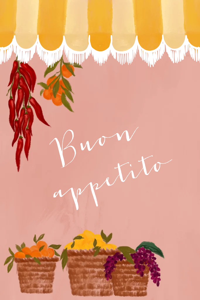 Passend bij de Siciliaanse trouwhuisstijl. Een menukaart volledig in dezelfde stijl en bijpassende kleuren.