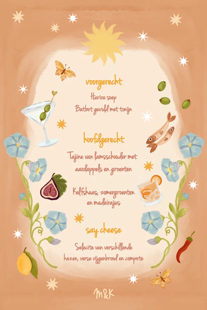 Een kleurrijke menukaart passend bij de trouwkaart met de sierlijke zwanen en palmbomen.