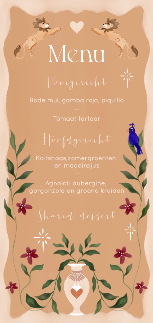 Uit de collectie met de leeuwen vaas. Een bijpassende menukaart om jouw gasten in stijl te laten weten wat er op het menu staat tijdens jullie grote dag.