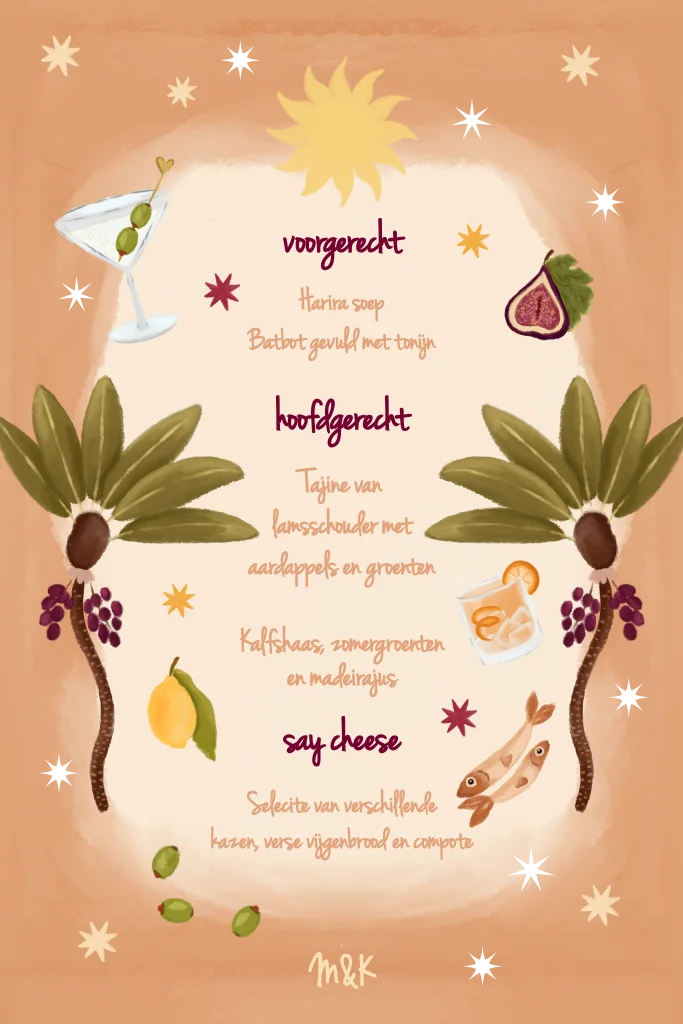 Een menukaart passend bij de collectie met de sierlijke zwanen en palmbomen.