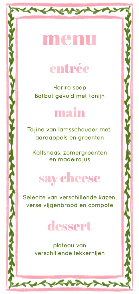 Lekker simpel met hippe kleuren. De roze tekst is met folie aangebracht op de menukaart.