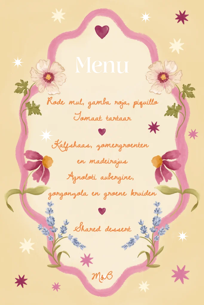 Passend bij de collectie met de wilde bloemen. Een gepersonaliseerde menukaart in geel met roze
