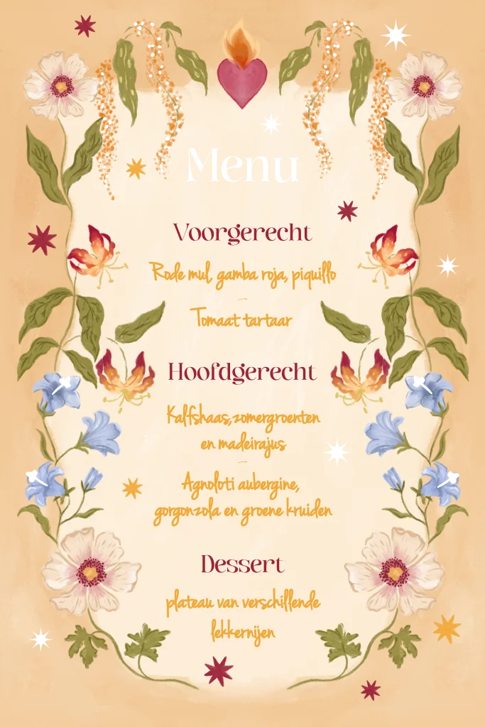 Stijlvolle menukaart voor je bruiloft. Pas het bloemrijke ontwerp naar wens aan in onze online editor.