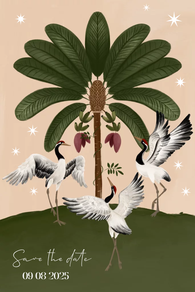 Deze echte geluksbrengers hebben alvast een voorschot genomen op het feestje. De kraanvogels doen een dansje onder de palmboom. Een feestelijke aankondiging van jullie trouwdag.