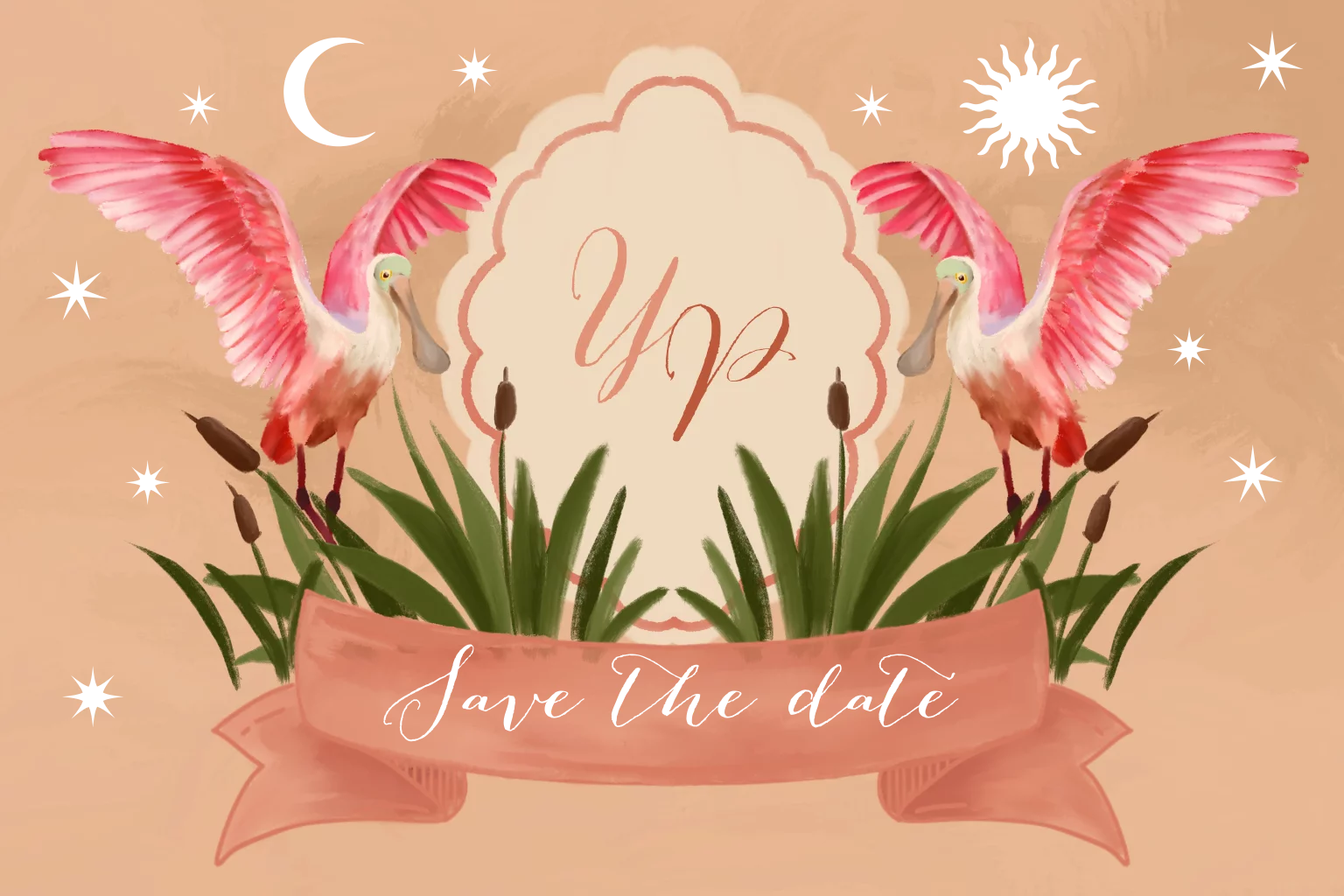 Breng jouw genodigden alvast op de hoogte van jullie aanstaande trouwerij. Deze sierlieke roze vogels zijn toch een feestje om te zien?!