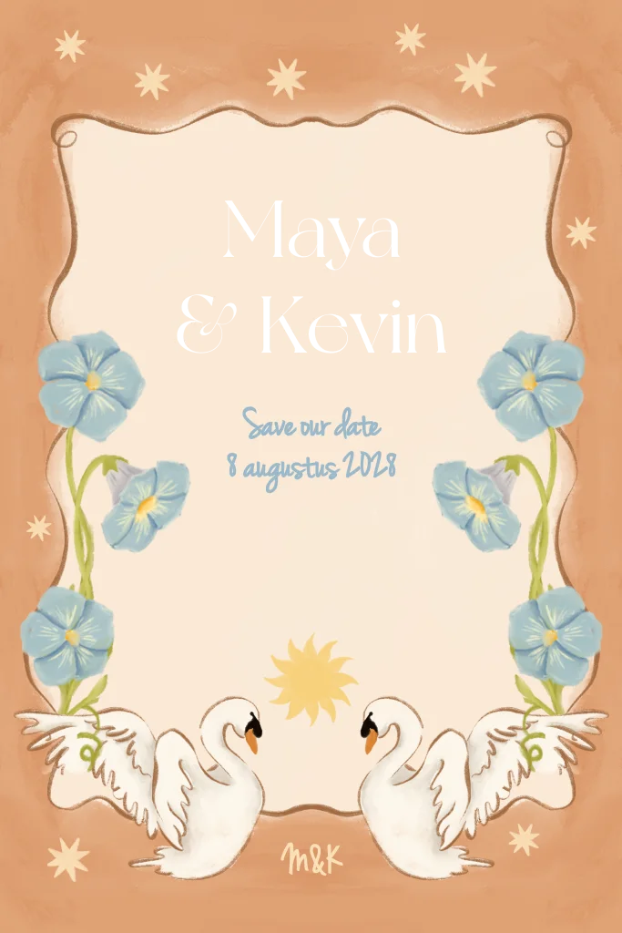 Een save the date kaart passend bij de trouwkaart met de sierlijke zwanen en palmbomen.