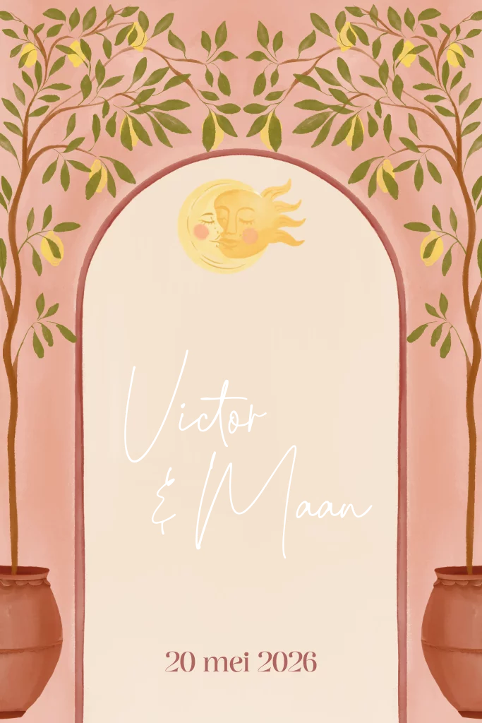 Een roze trouwkaart met kleine citroenbomen.
