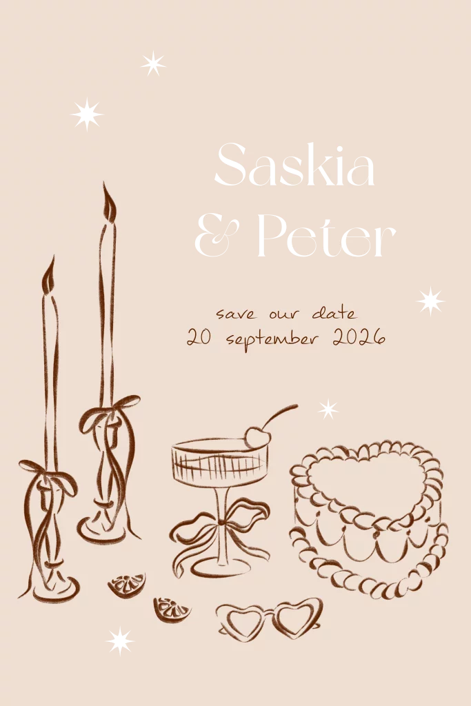 Subtiele lijntekeningen als trouwkaart voor jullie bruiloft. Een mooie voorbode van wat er komen gaat: heerlijk eten, champagne en taart!