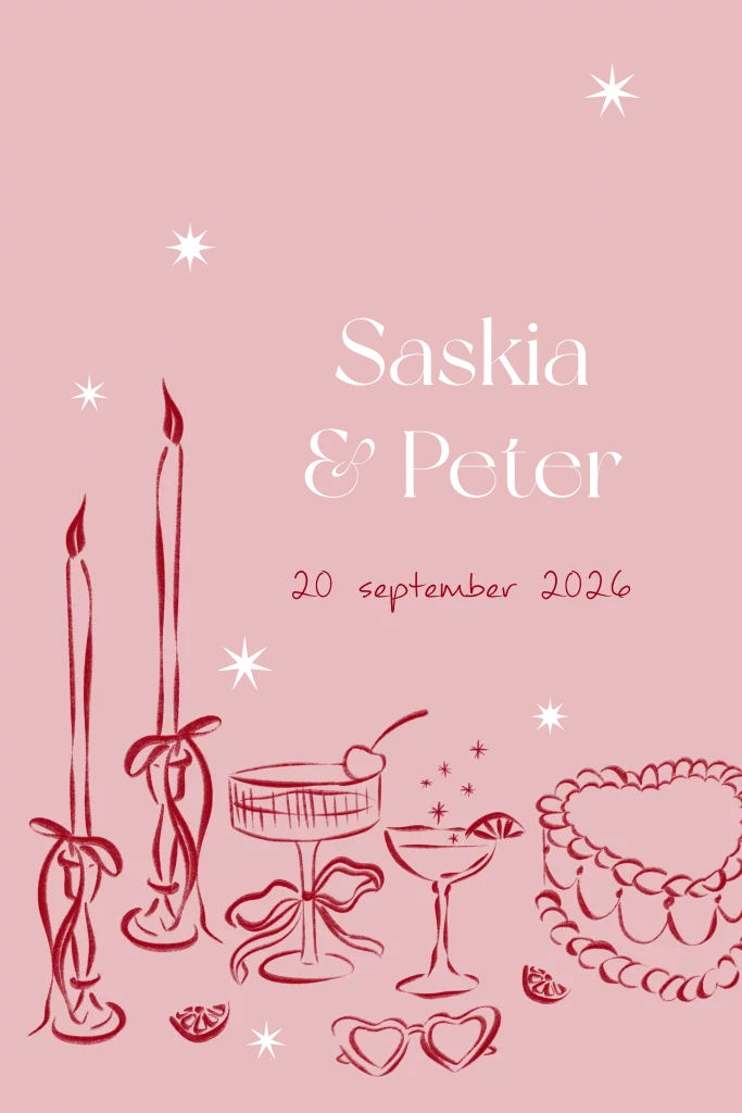 Subtiele lijntekeningen als trouwkaart voor jullie bruiloft. Een mooie voorbode van wat er komen gaat: heerlijk eten, champagne en taart!