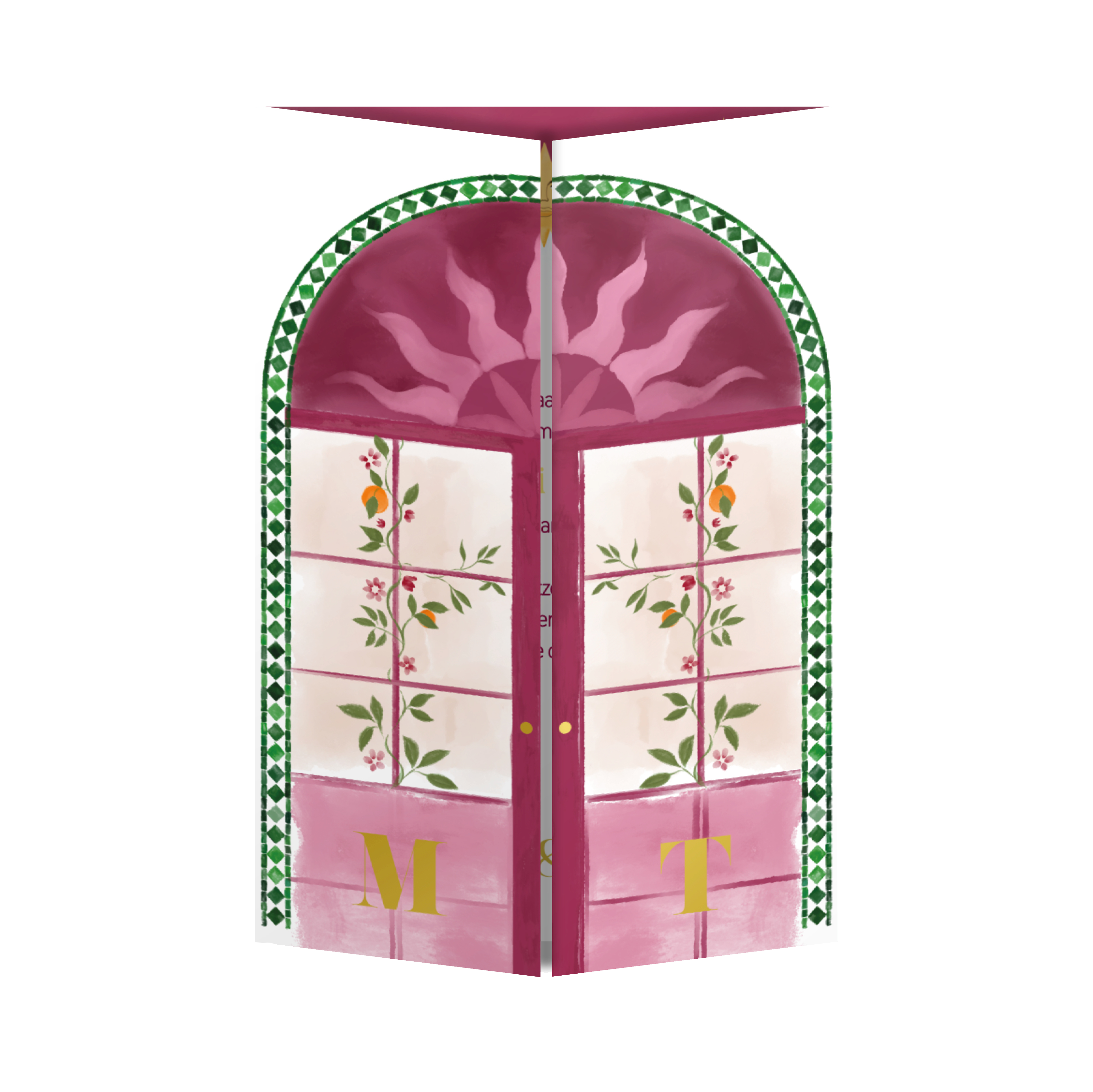 Een elegante trouwkaart met engelen en bloemen in roze tinten. De gasten kunnen figuurlijk de poorten openen en ontdekken wat er schuil gaat achter deze prachtige trouwkaart met theatervouw.
