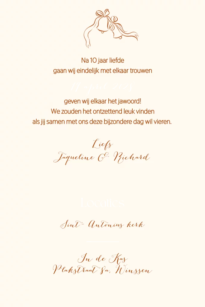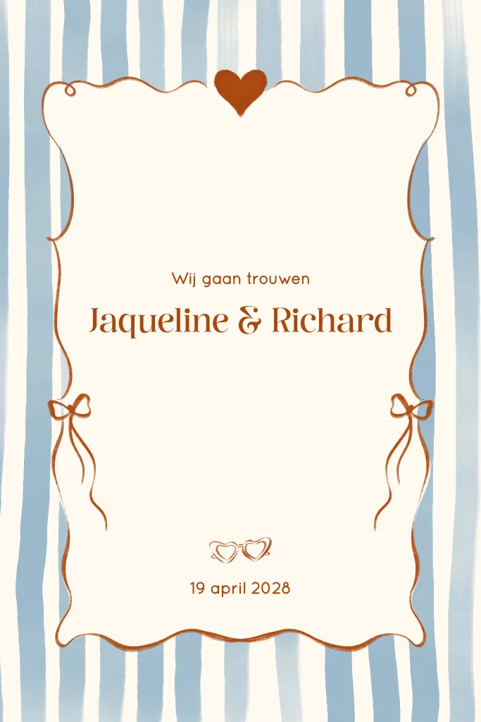 Een trouwkaart met blauw strepen, zachte beige tint en bruine details.