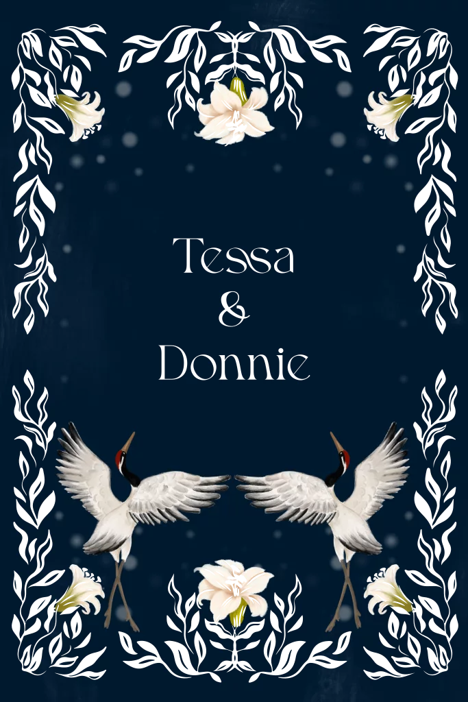 Sierlijke kraanvogels op een kaartje vol met goudfolie en prachtige lelies.