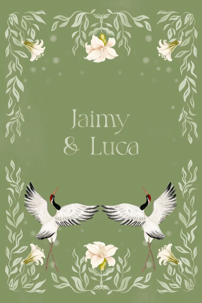 Sierlijke kraanvogels op een kaartje vol met groene folie en prachtige lelies.