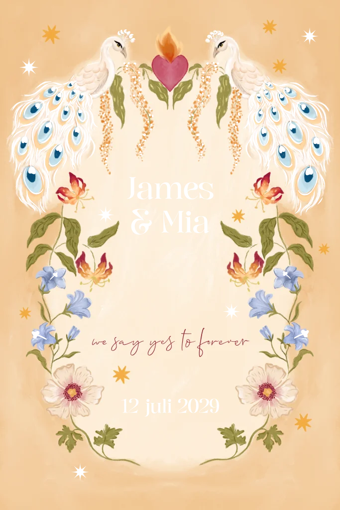 Een elegante trouwkaart met witte pauwen en wilde bloemen. Ook super leuk als save the date.