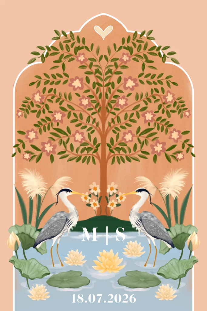 Een romantisch landschap met twee reigers. Omringd door waterlelies en bloemen. De kaart is ook verkrijgbaar in een andere kleurstelling.