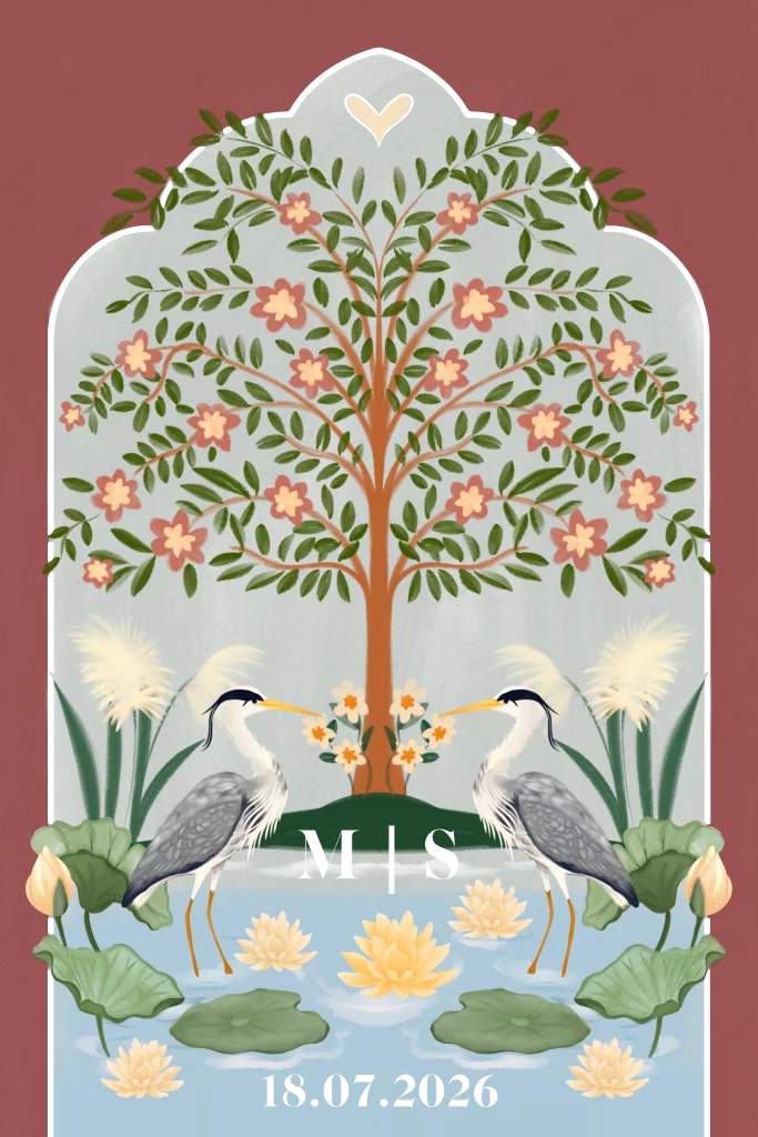 Een romantisch landschap met twee reigers. Omringd door waterlelies en bloemen. De kaart is ook verkrijgbaar in een andere kleurstelling.