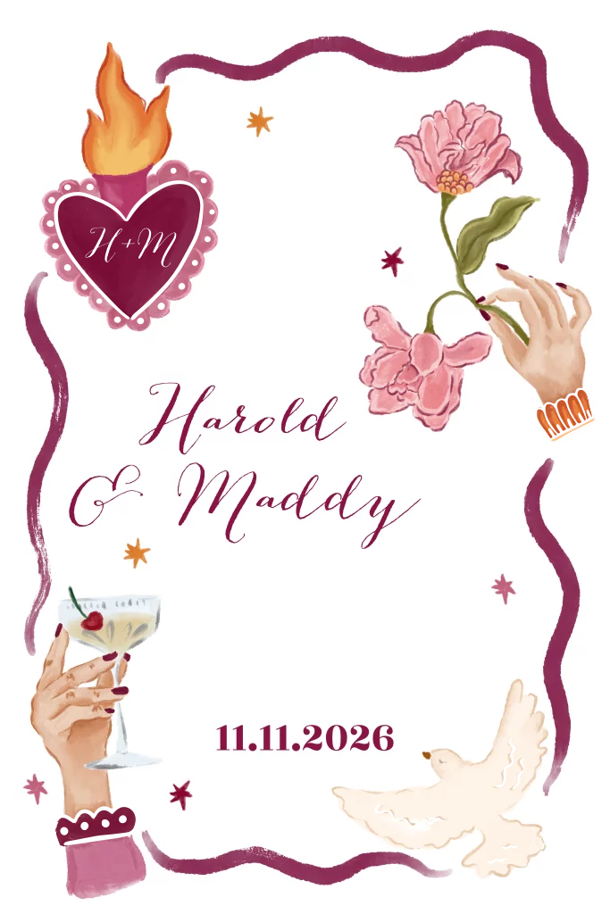 Proost, op de liefde en een onvergetelijk dag. De trouwkaart is versierd met bloemen en sacred heart.