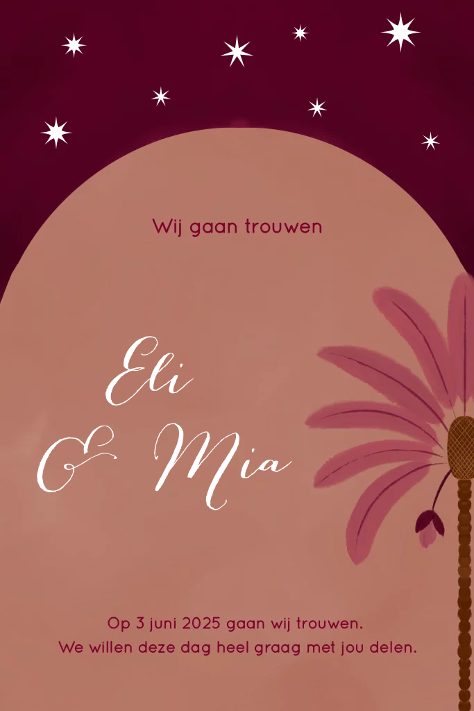 Romantisch en een heel warme sfeer. Binnenkort vliegen jullie samen uit en dat vieren jullie met je familie en vrienden tijdens de grote dag!