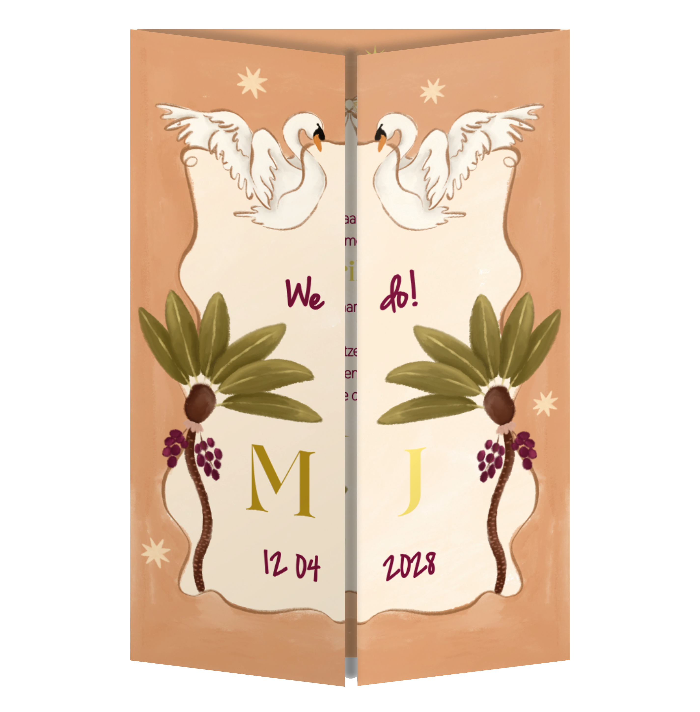 Trouwkaart zwanen en palmen theatervouw